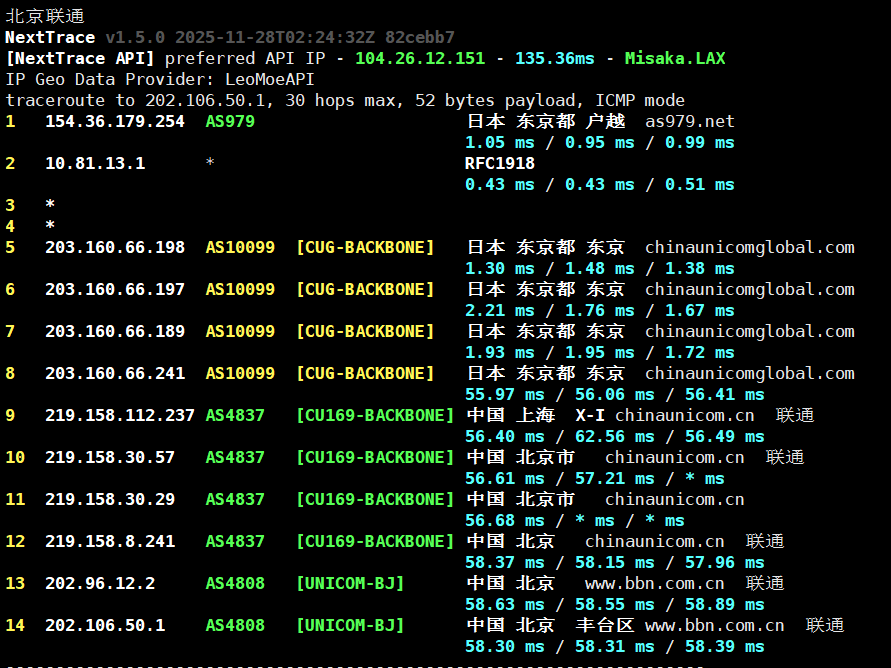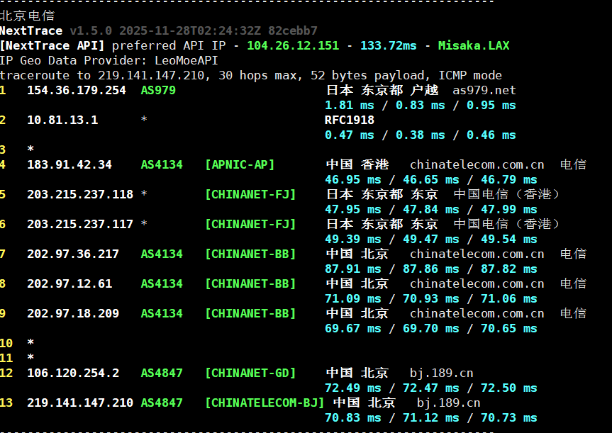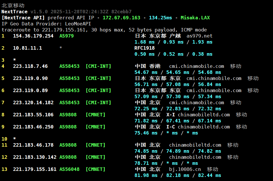 通过拨测工具显示,东京 BGP 线路在国内三网表现非常均匀,平均延迟极低,尤其适合对延迟敏感的业务。