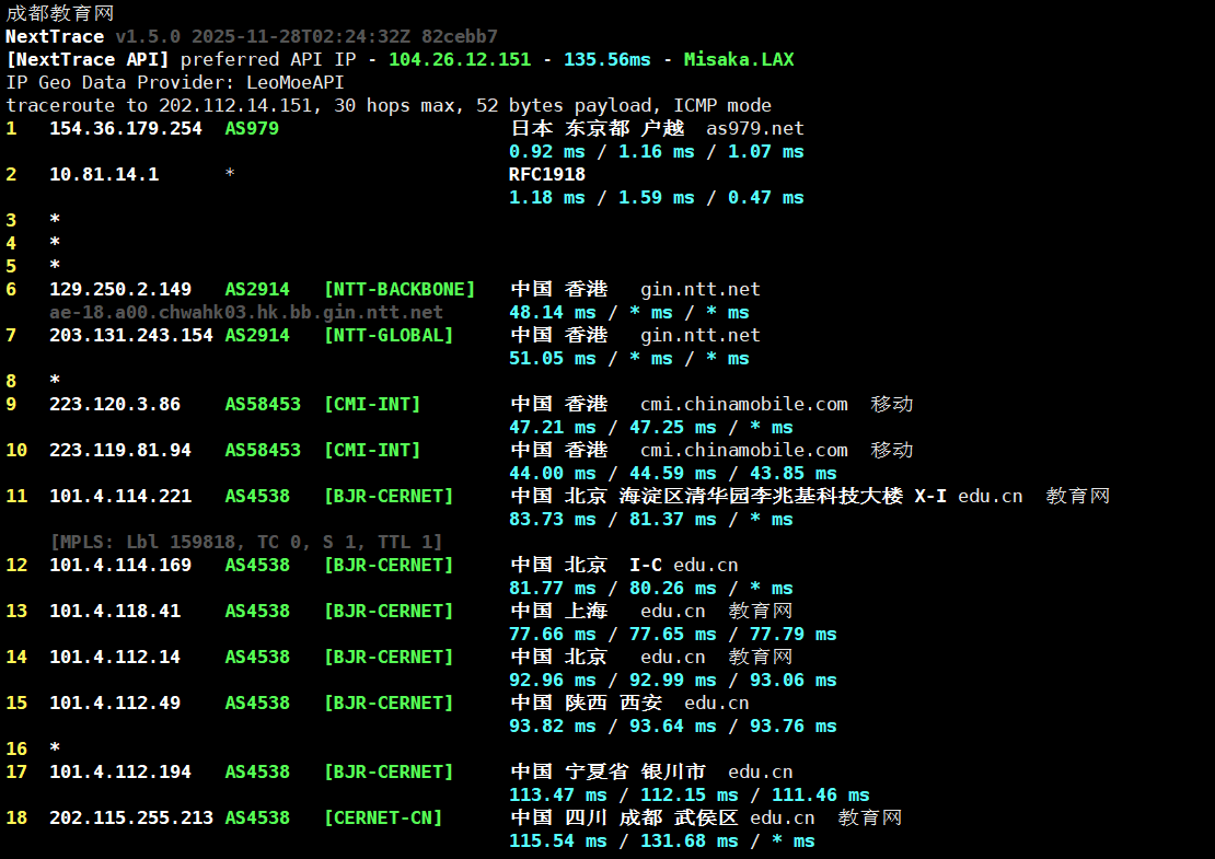 🛤️ 三、 路由追踪:回程三网+教育网优化